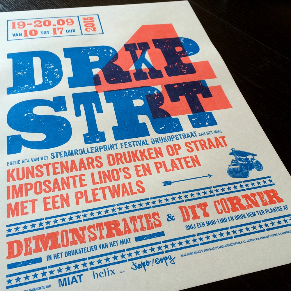 The 4th edition of the spectacular steamroller printing event DRUKOPSTRAAT is coming your way! It will take place on 19-20 September, from 10 till 17, in front of the MIAT, Gent.