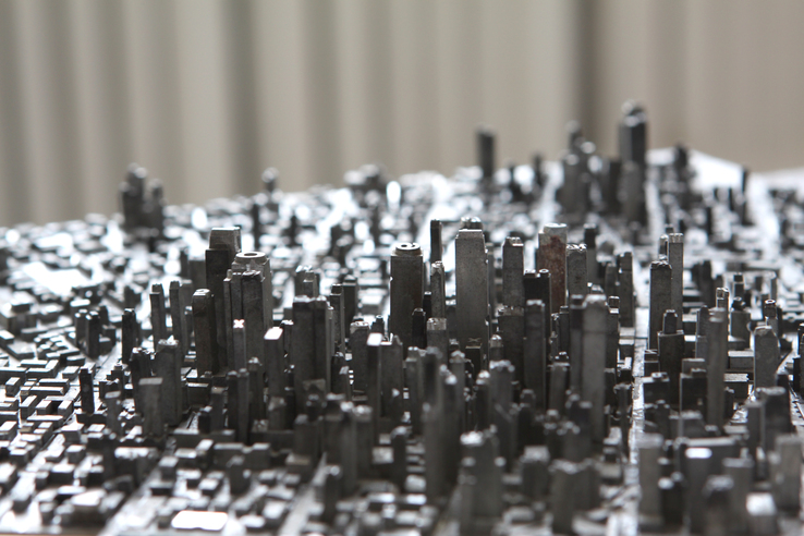 “Among his contemporary works on display, Type City is Jang’s sprawling metalopolis seaport made of tall lead type buildings and boulevards bisecting the city into a topographic and typographic landscape. With the patience of a skilled hand typesetter, he set the tall buildings of metal type upright so they are capped with individual letters. Long lead piers stretch out to the sea, and empty city blocks and sidewalks of spacing material frame the city center.”