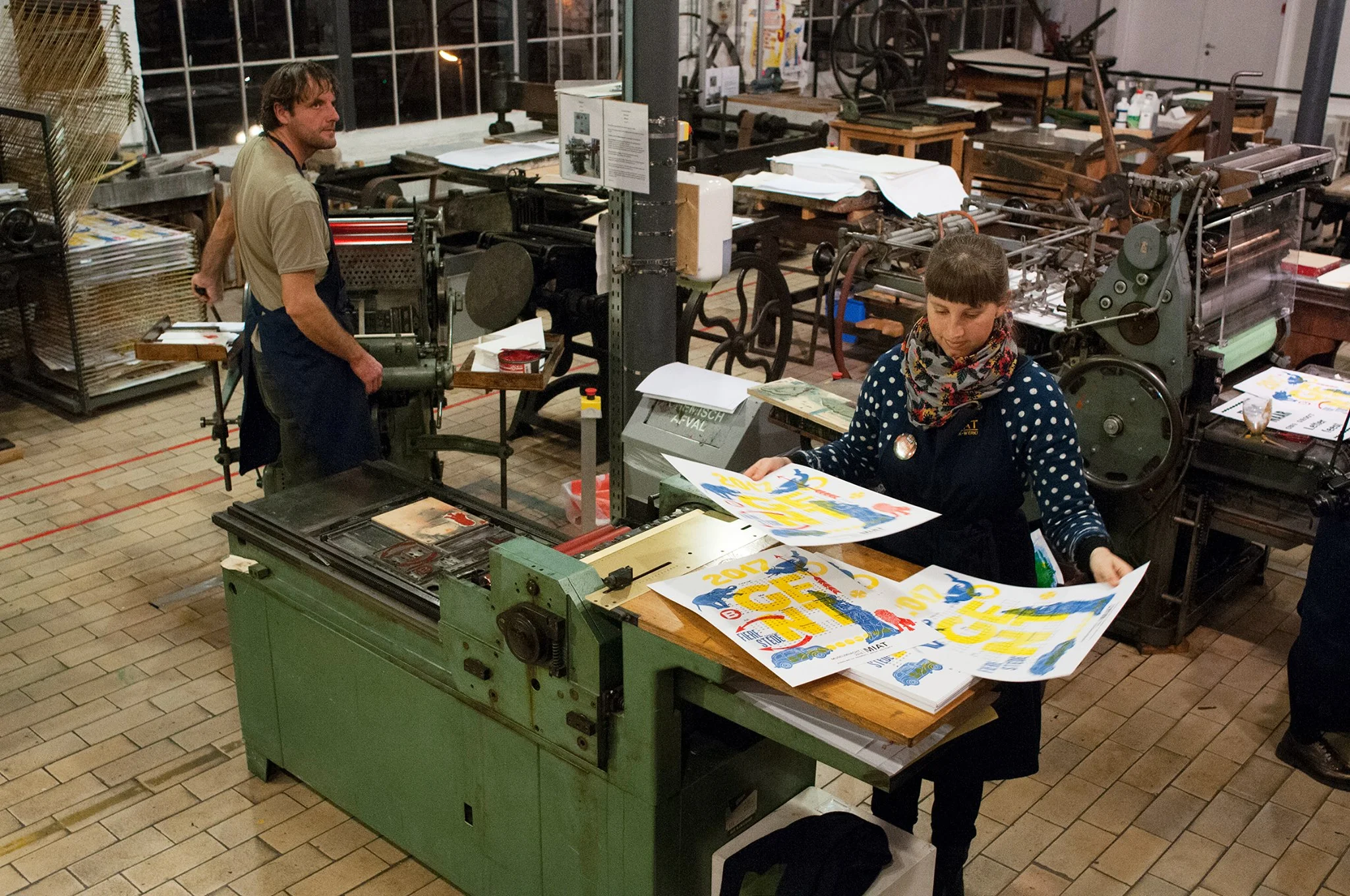 We decided to print 3 colours up front and the 4th colour was printed on the Museum Night evening itself, so the visitors could actually witness the printing process. At the end of the day more than 250 copies were given away to the public and as we run out of calendars we quickly made a new, simplified (one colour) version which was also gone by the end of the day:) Well, printing till 1 o'clock at night was quite fun, but tiring experience, so we cleaned up the presses and went for a drink.