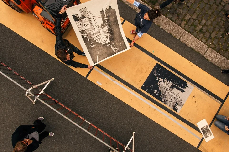 During this two-day event around 20 artists will be printing their impressive large pieces of linocut (carved in advance) not on a printing press, but on the street and with a steamroller, a road construction machine which normally is being used for road maintenance.