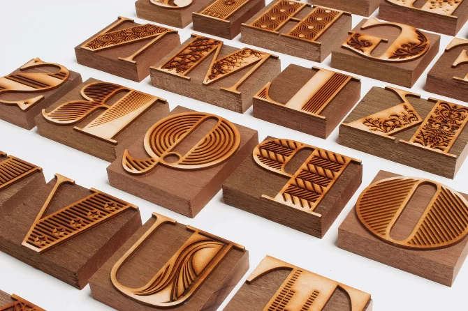 This decorative alphabet was produced by Nigel Bents, Paul Oakley and Jonny Holmes at Chelsea College of Art & Design. Based on a downloaded Bodoni Poster font, it was designed digitally by students using Illustrator, laser cut out of 3mm plywood by Cut Laser Cut in Vauxhall and mounted on type-high block by Stef Willis in the college workshop.