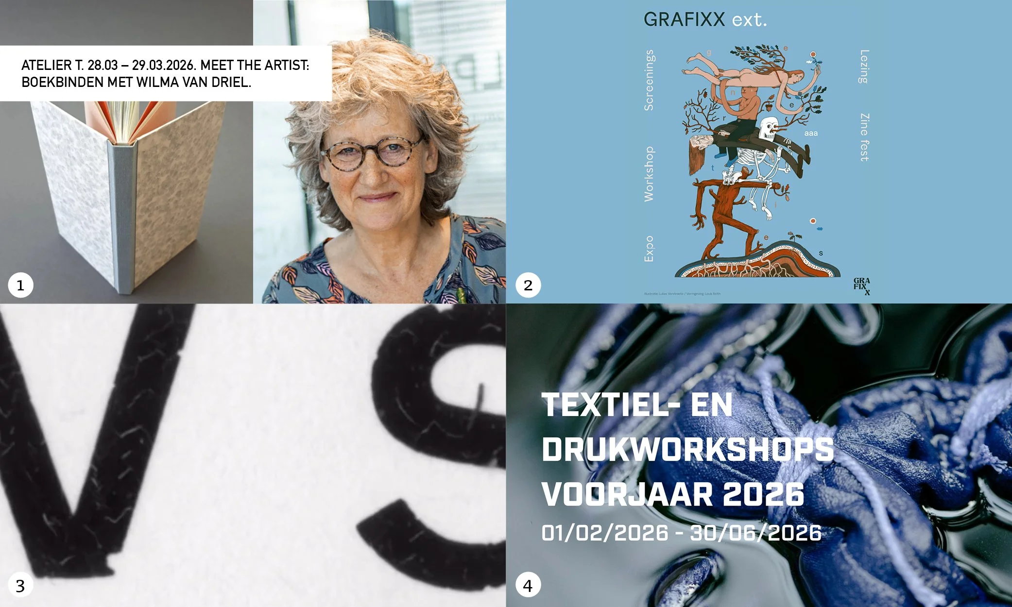 3. Mini-Expo // Lang leve de zwarte kunst. Van 24 januari tot 23 februari 2026 presenteren de deelnemers van de jaaropleiding ‘Lang leve de zwarte kunst’ hun werk in een mini-expo. Een jaar lang verdiepten ze zich onder begeleiding van ervaren rotten Thomas Gravemaker, Armina Ghazaryan en Niels Goovaerts in de kunst van het letterzetten. In de expo tonen ze, naast eigen werk, ook het eindwerk dat ze maakten als slotopdracht. 24.01.2025 - 23.02.2026, Industriemuseum - link